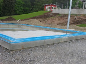 Wir empfehlen aus diesem Grund, gleich nachdem die Folienauskleidung angelegt wurde, das Schwimmbecken mit etwa 15 cm Wasser zu befüllen. Durch diese geringe Wasserhöhe wird die Folienauskleidung geschützt, während alle anderen Arbeiten am Schwimmbecken weiter geführt werden können. Schwimmbecken mit Folienauskleidung bleiben im Winter meistens mit Wasser befüllt. Eventuelle Eisdruckkräfte lassen sich mit Hilfe von Eisdruckpolstern ausgleichen.