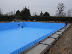 Sie wird direkt vor Ort im Schwimmbecken in einzelnen Folienbahnen verlegt, die dann fugenlos miteinander verschweißt werden. Der Untergrund des Schwimmbeckens kann dabei aus allen Materialien bestehen, die großen Wassermengen standhalten.