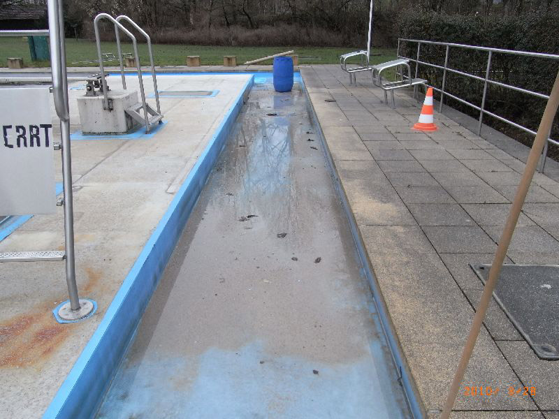Die Hohlräume sind im Anschluss mit Estrich aufzufüllen. Das Schwimmbad lässt sich, nachdem die defekten Fliesen entfernt wurden, mit einer Folienauskleidung sanieren. Allerdings kann sich die Struktur der Fliesen auf der Folie abzeichnen, sodass diese sichtbar ist. Das kann als störend empfunden werden. Es lohnt sich also, alle Fliesen zu entfernen, das Becken neu zu verspachteln, sodass die Wände des Beckens glatt sind, und anschließend eine Folienauskleidung anzulegen. Für alle Einbauteile wie den Skimmer, die Einlaufdüsen, den Bodenablauf usw. gibt es spezielle Systemlösungen, damit eine Folienauskleidung vorgenommen werden kann und die entsprechenden Einbauteile erhalten bleiben können.